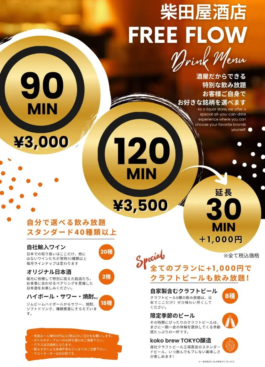 このたび当店では、酒屋ならではの豊富なラインナップを心ゆくまでお楽しみいただける、セルフスタイルの飲み放題「FREE FLOW」プランをスタートいたしました!